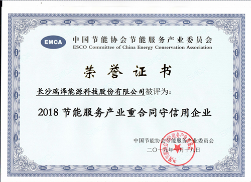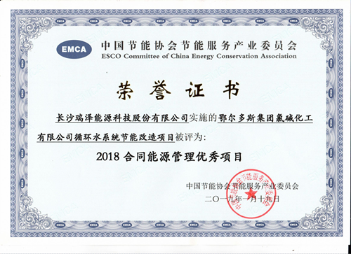 瑞澤能源能源在2018年節能服務行業的出色表現再度榮獲“2018節能服務產業重合同守信用企業”、“2018EMCA優秀會員單位”,瑞澤實施改造的“鄂爾多斯集團氯堿化工有限公司循環水系統節能改造”項目獲“2018合同能源管理優秀項目”獎。